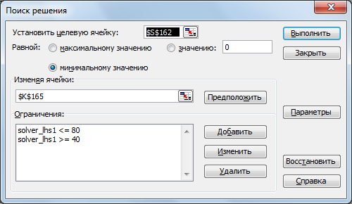Удивительно, но факт: все настройки (адреса ячеек, ограничения) перенесутся в файле .xlsx в главное окно Поиска Решения, и нам останется только лишь выбрать метод поиска, нажав кнопку «Параметры», оставив все остальные тонкие настройки выставленными по умолчанию.