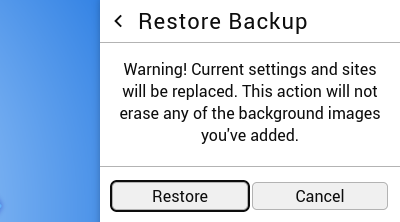 In the process of restoring a backup, SwiftDial will determine the type of the file, inform you what will be replaced, and, after you click «Restore», will replace all the appropriate settings, groups, sites and/or images with the ones from the backup.