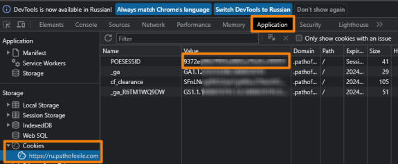 Заходим в свой профиль на сайте -> нажимаем F12 -> переходим в раздел Application -> переходим в Cookies -> нажимаем на сайт PoE -> в строке POESESSID копируете ID -> вставляете в строку POESESSID в POB.