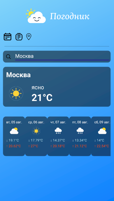 Для начала была создана главная страница, на которой отображалась погода того города которого введёт пользователь. Погода получается по средствам api openweathermap. Первая реализация отображала погоду на один день, в дальнейшем было реализовано отображение погоды на 5 дней. Используется архитектура MVVM, внедрение зависимостей через DI:
