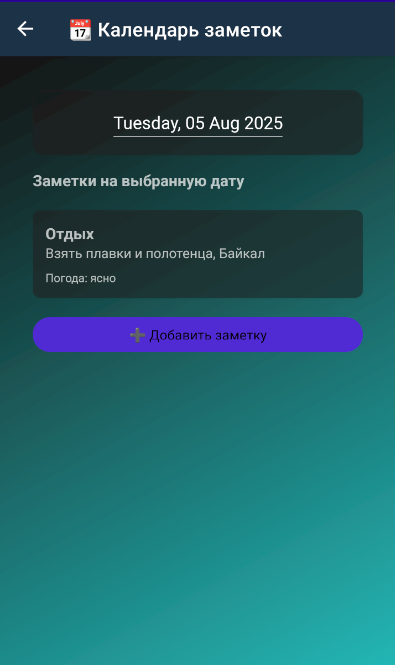Фича с заметками и календарём пришла в процессе — оказалось удобно сохранять события по определённой дате и городу. Пользователь может просматривать и фильтровать свои заметки, связанные с погодными условиями.